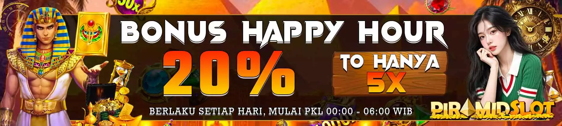 - Kode Promo bonus di depan: HAPPY HOUR SLOT 20% TO 5x.
